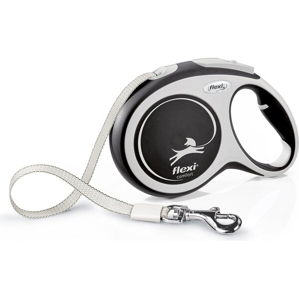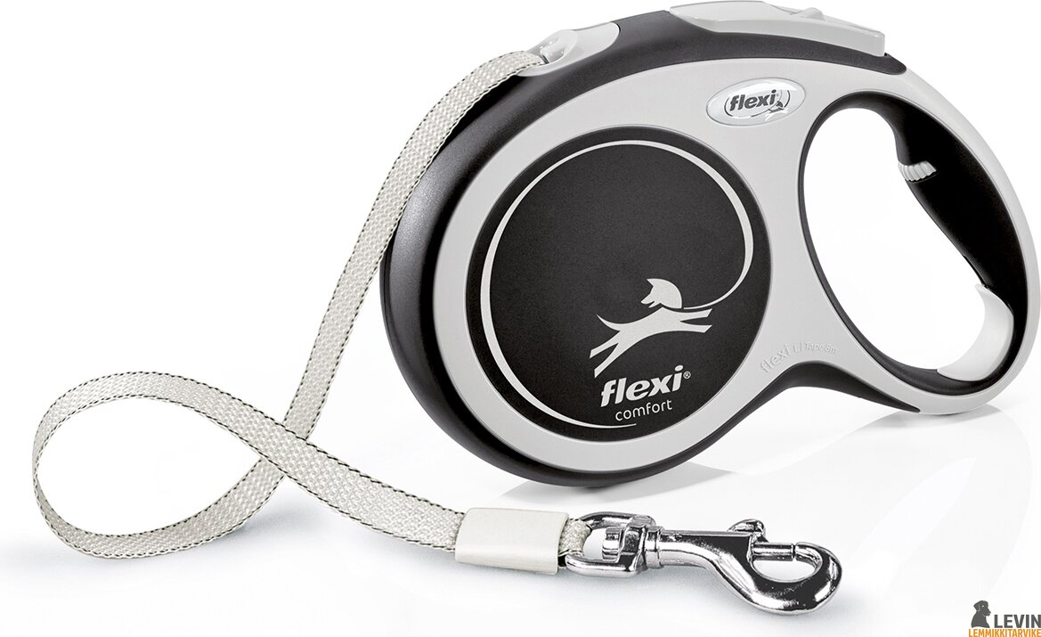 Flexi New Comfort L on 8 metriä pitkä kelatalutin keskikokoisille ja isoille koirille, joiden paino on maksimissaan 50 kg. Taluttimessa on leveä nylonnauha, joka kelautuu automaattisesti sisään ja ulos eikä laahaa maassa. Kelataluttimessa on pysäytysnappi sekä lukitus, jonka avulla voit lukita taluttimen pituuden ja samalla kelausmekanismi poistuu käytöstä. Flexi antaa koiralle enemmän liikkumatilaa verrattuna perinteiseen kiinteään talutushihnaan. 8 metrin Flexi on parhaimmillaan esimerkiksi metsässä, metsäteillä tai poluilla liikuttaessa.