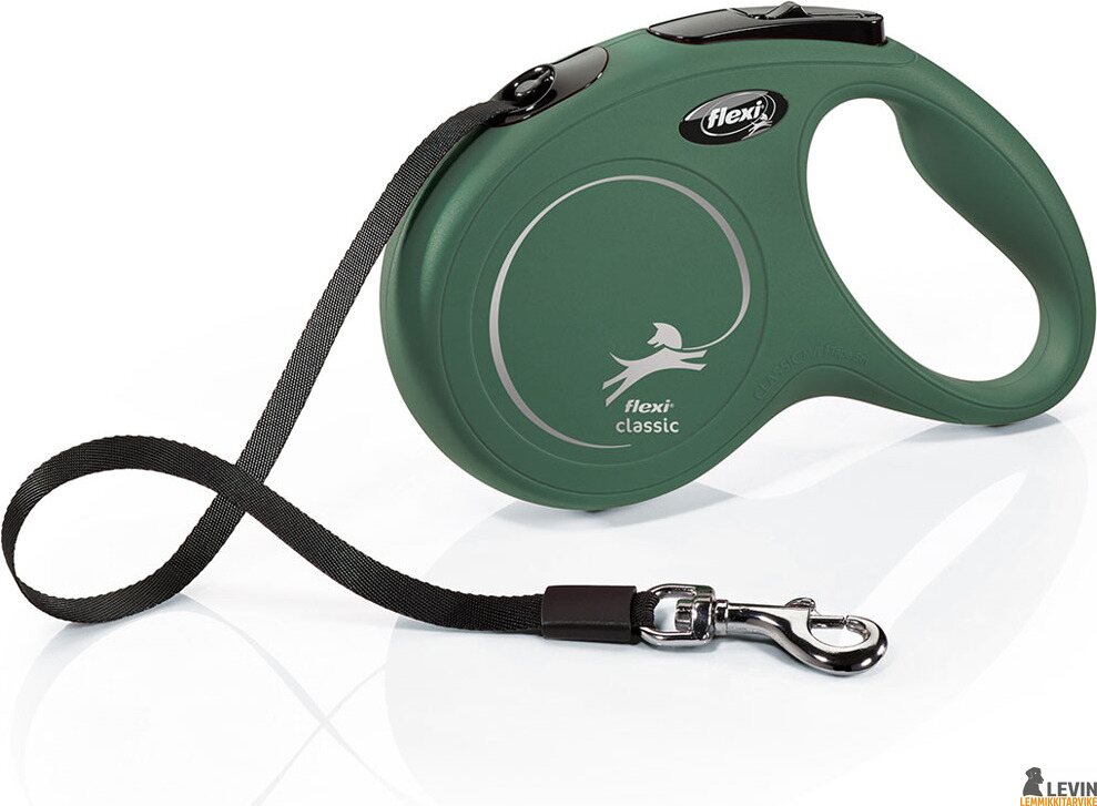 Tuotteen kuvausFlexi New Classic M on 5 metriä pitkä kelatalutin pienille ja keskikokoisille koirille, joiden paino on maksimissaan 25 kg. Taluttimessa on leveä nylonnauha, joka kelautuu automaattisesti sisään ja ulos eikä laahaa maassa. Kelataluttimessa on pysäytysnappi sekä lukitus, jonka avulla voit lukita taluttimen pituuden ja samalla kelausmekanismi poistuu käytöstä. Flexi antaa koiralle enemmän liikkumatilaa verrattuna perinteiseen kiinteään talutushihnaan. Lisävaruisteina M koon Flexiin saa liitettyä LED-valon ja Multi Box-kotelon.