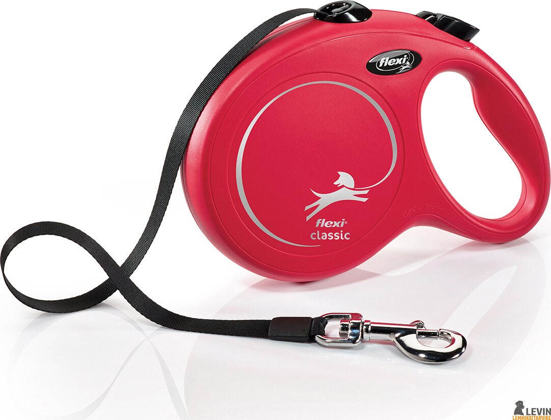 Tuotteen kuvausFlexi New Classic L on 8 metriä pitkä kelatalutin keskikokoisille ja isoille koirille, joiden paino on maksimissaan 50 kg. Taluttimessa on leveä nylonnauha, joka kelautuu automaattisesti sisään ja ulos eikä laahaa maassa. Kelataluttimessa on pysäytysnappi sekä lukitus, jonka avulla voit lukita taluttimen pituuden ja samalla kelausmekanismi poistuu käytöstä. Flexi antaa koiralle enemmän liikkumatilaa verrattuna perinteiseen kiinteään talutushihnaan. 8 metrin Flexi on parhaimmillaan esimerkiksi metsässä, metsäteillä tai poluilla liikuttaessa. Lisävaruisteina L koon Flexiin saa liitettyä LED-valon ja Multi Box-kotelon.