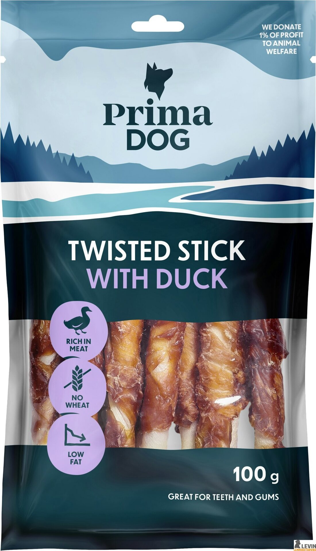 PrimaDogin Ankkapurutikku on herkullinen nautapuruluu, jonka päälle on kääritty mehevä ankkafilee. Naudannahasta valmistettu puruluu auttaa pitämään koirasi hampaat puhtaina ja ankkafilee tuo makua tähän kevyeen herkkuun. Sopii erityisesti pienille koirille.