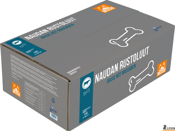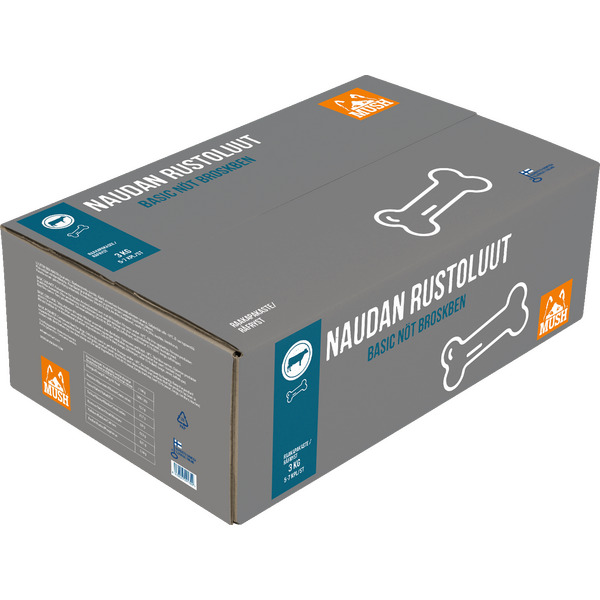 MUSH Basic Naudan Rustoluut on raaka täydennysravinto, joka on kokonaan syötävä luu erityisesti isoille koirille. Luita annettaessa vatsan toimintaa tulee seurata, koska liiallinen luumäärä kovettaa vatsaa ja ulostaminen voi vaikeutua.