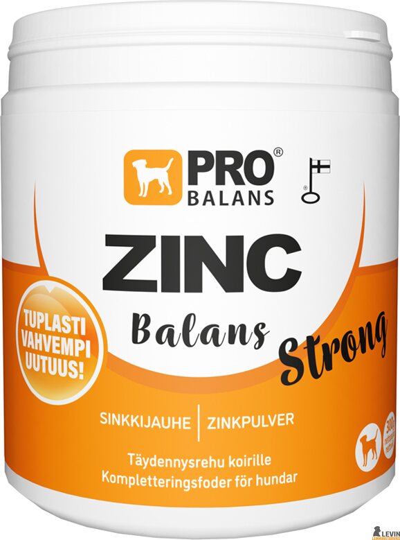 Probalans Zincbalans Strong sinkkijauhe ylläpitää ihon ja turkin hyvinvointia. Riittoisa ja vahvempi, kuin tavallinen versio. Tehokas apu esimerkiksi lemmikin ihon ongelmiin, kuiville anturoille tai halkeileville kynsille. Sinkkijauhe annostellaan lemmikin painon mukaan, mukana tulevan mittalusikan avulla. Zincbalansia voidaan antaa lemmikille 4-6 viikon kuurina esimerkiksi karvanlähdön tai näyttelyihin valmistautumisen yhteydessä, tai jatkuvassa käytössä täydentämään lemmikin koti- ja raakaruokavaliota.