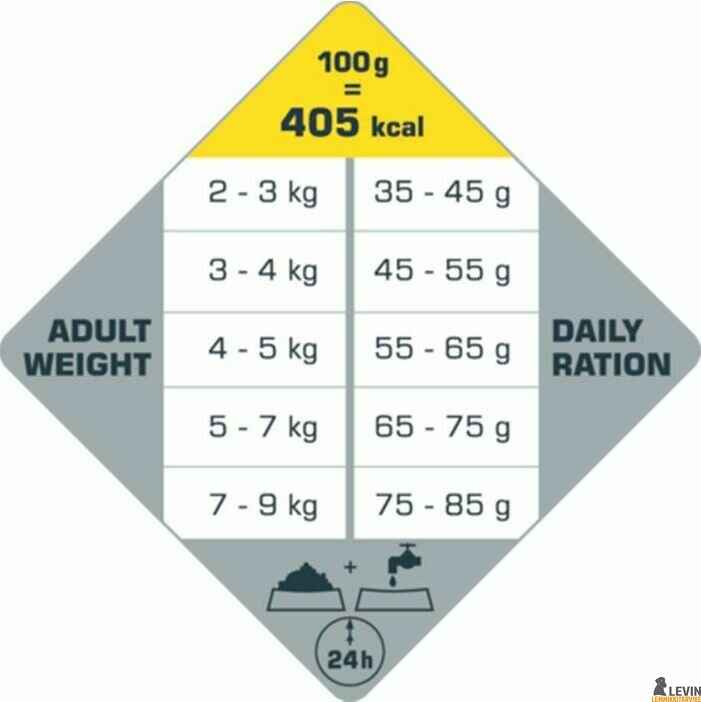 RAVINTOAINEET: Valkuainen 38,0 % (*87,0 % eläinproteiinia kokonaisproteiinipitoisuudesta), rasva 17,0 %, hehkutusjäännös 7,5 %, raakakuitu 5,0 %, kalsium 1,2 %, fosfori 1,0 %, tauriini 4300 mg / kg.