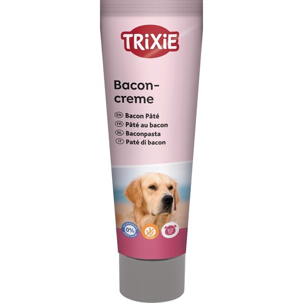 Voimakkaan tuoksuinen kermainen pekoni pate koiralle kätevässä tuubissa. Helpottaa esimerkiksi lääkkeiden antoa tai voidaan laittaa Kongin sisään herkuksi. Gluteeniton.