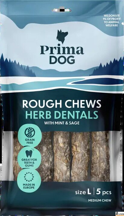 PrimaDogin Rough Chews Hammashoitoluu yrtti on maukas rouhetikku, joka tukee koiran ikenien ja hampaiden hyvinvointia. Hammashoitoluu sisältää runsaasti proteiinia ja vain vähän rasvaa sekä on täysin viljaton ja säilöntä-aineeton. Naudannahasta valmistettuun rouhetikkuun on lisätty yrttejä, jotka raikastaa koiran hengitystä.