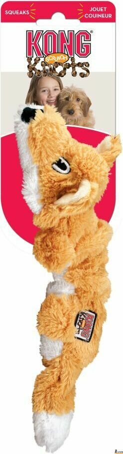 Tuotteen kuvausKong Scrunch Knots Fox on lähes täytteetön joustava pehmolelu, jonka sisällä on solmittuja köysiä. Köysi antaa lelulle lisää kestävyyttä rajuissakin leikeissä. Ketun päässä on lisäksi vinku. Pituus 36 cm.