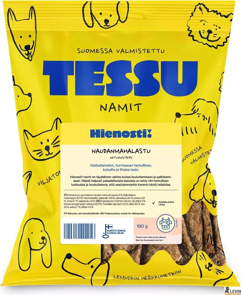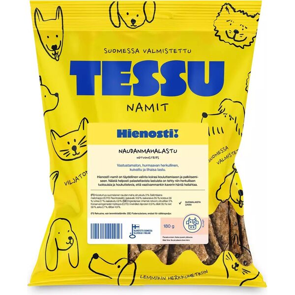 Tessun Naudanmahalastu on vastustamaton herkku ja se maistuu usein nirsoillekkin koirille mainiosti! Helposti pienempiin paloihin murrettava herkku, joka ei kuitenkaan murusta älyttömästi taskun pohjalle. Kokeile myös haastavammissa koulutustilanteissa. Uudelleensuljettava ja kierrätettävä pussi on helppo pitää mukana. Sopii mainiosti myös kissojen herkuksi!