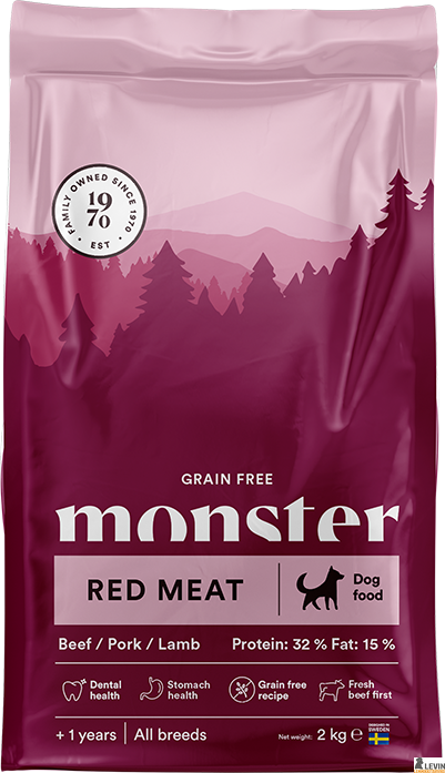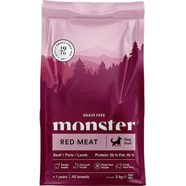 Monster Grain Free Adult Red Meat koiranruoka on monipuolisesti erilaisia proteiineja sisältävä täysravinto. Reseptissä on paljon naudan-, sian- ja lampaanlihaa. Helposti sulava ja herkullinen ruoka sisältää kaikki koirasi tarvitsemat ravintoaineet. Resepti on täysin viljaton.