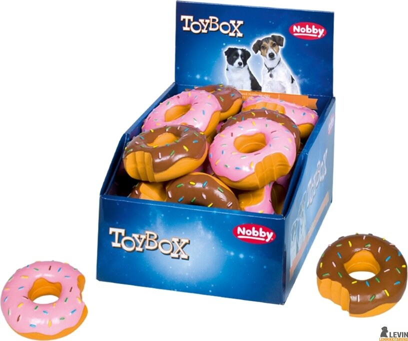 Syötävän suloinen Nobbyn donitsi vinkulelu hurmaa sekä omistajan, että koirakaverin. Donitsi on halkaisijaltaan noin 10 cm ja siinä on vinku. Vaaleanpunainen donitsi tuoksuu mansikalta ruskea suklaalta.