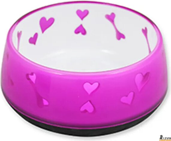 All For Paws Pet Love on kovasta muovista valmistettu ruokakuppi, joka on kuvioitu sydämillä ja luukuvioilla. Kupin alaosa on painava ja mustaa kumia, joten kuppi pysyy hyvin paikoillaan. Väri pinkki