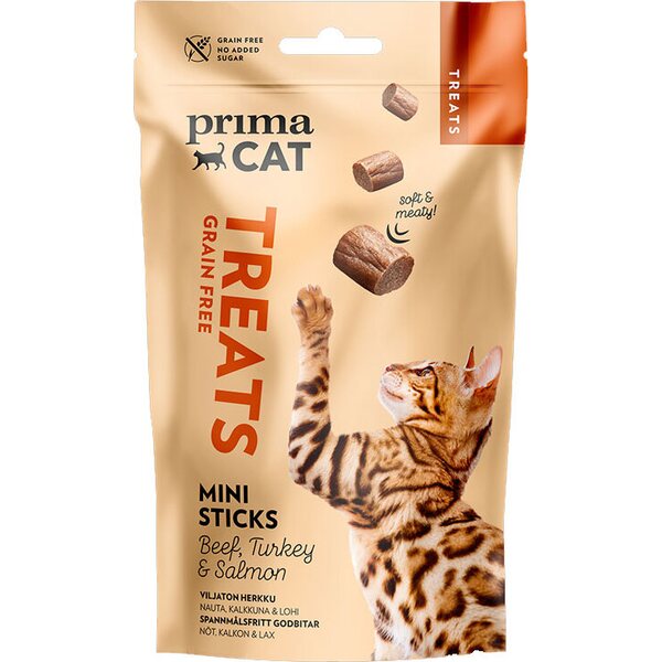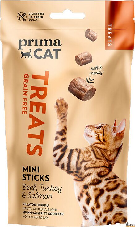 Naudan, kalkkunan ja lohen makua yhdistelevä puolikostea minitikku-herkku on sopivan pehmeä syötäväksi sellaisenaan tai se on helppo paloitella pienemmiksi paloiksi. PrimaCat Treats -sarjan herkut ovat viljattomia, eivätkä ne sisällä lainkaan lisättyä sokeria. Valmistettu Euroopassa.