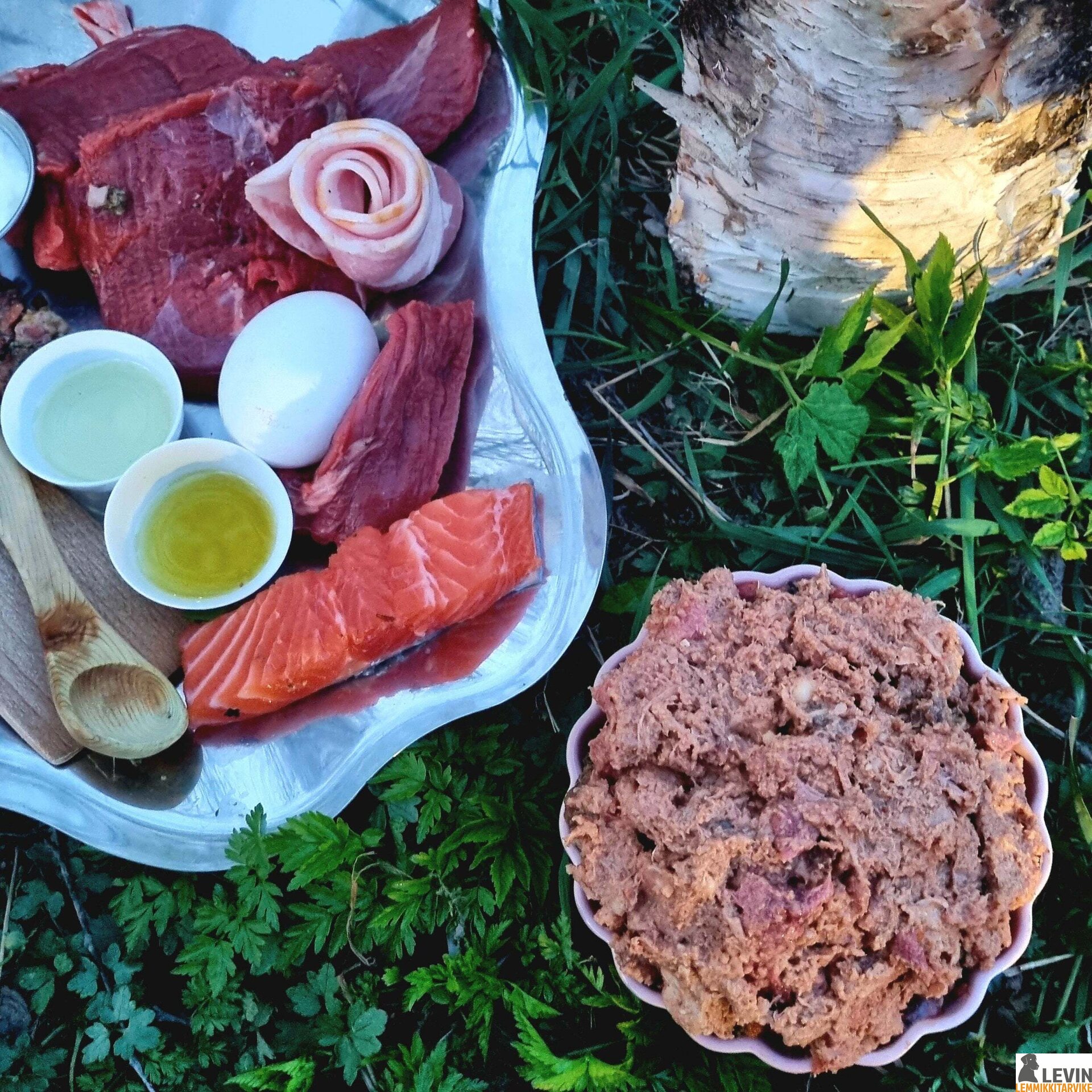 KOOSTUMUS: vapaana laiduntavan lampaan liha ja lampaan rasva, lampaan sisäelimet (maksa, sydän, munuaiset), taimen, sian rasva, tuoreet kokonaiset kananmunat, pellavansiemenöljy, kalanmaksaöljy, tuore täysjogurtti