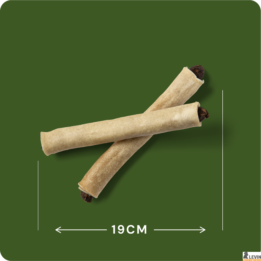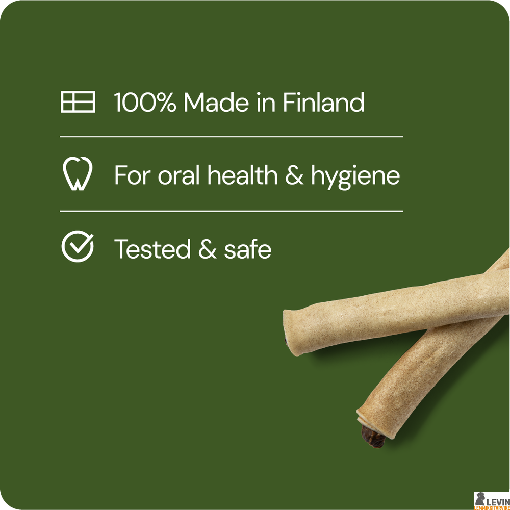 RAUH! Moose Bullet on kestävä ja herkullinen puruluu erityisesti pienille ja keskikokoisille koirille. Tämä ainutlaatuinen herkku yhdistää suomalaisen hirvennahan ja rapeaksi paahdetun Moose Salami -täytteen – makuelämys, jonka eteen koirasi tekee mitä vain!